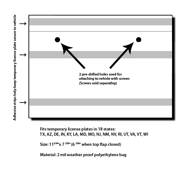 - Fits Temporary License Plates in - TX, AZ, DE, IN, KY, MD, NJ, NM, NV, RI, UT, VA, VT, WI