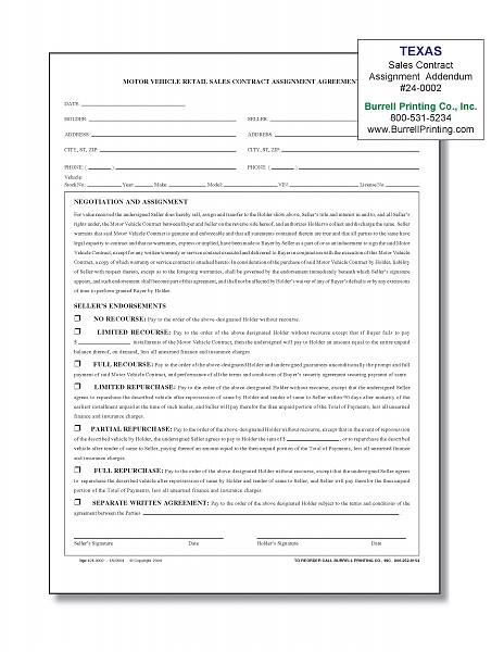 For use when assigning a installment contract to a 3rd party under special conditions. Designed to work with all our Motor Vehicle Installment Contracts.