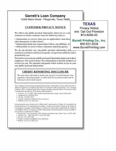 This Privacy Notice meets both Texas OCCC and Federal GLB guidelines. This Notice is for use when the Dealer will not be sharing the customer’s personal financial information with non-affiliated 3rd parties.
