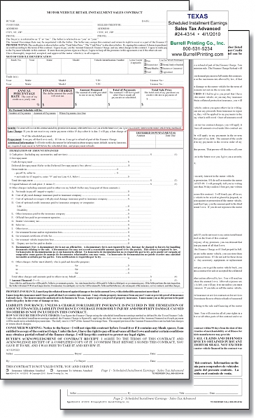 This installment contract is designed for the financing of retail motor vehicle sales where the payments are collected weekly, bi-weekly, monthly or Balloon. The refunding method used in this contract is the Scheduled Instament Earnings (Precomputed.)