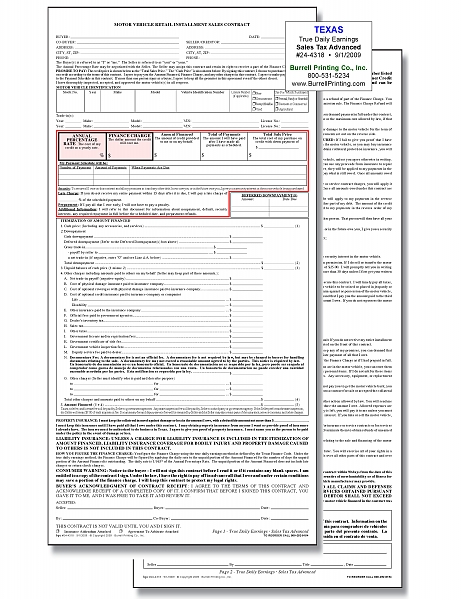 This installment contract is designed for the financing of retail motor vehicle sales where the payments are collected weekly, bi-weekly, monthly or Balloon. The refunding method used in this contract is True Daily Earnings (Simple Interest.)