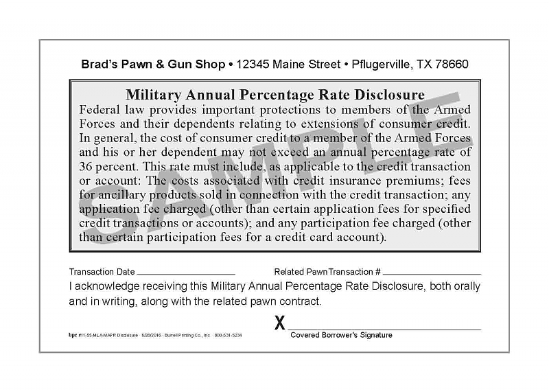 This MLA-MAPR disclosure is to be used when making an MLA loan. When you make an MLA loan you are required to give the borrower, along with your pawn ticket, a very specifically worded disclosure. MLA-MAPR disclosure, this is that disclosure.