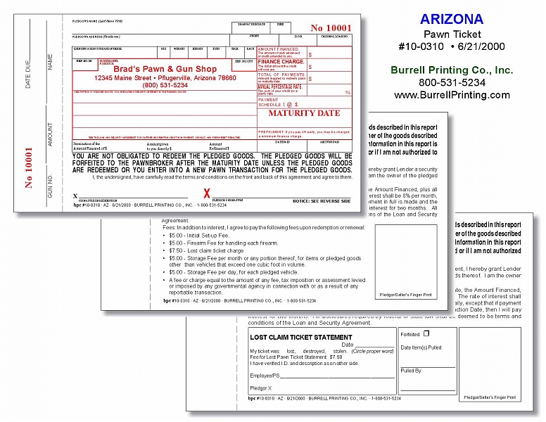 Arizona Handwritten Pawn Ticket 10-0310