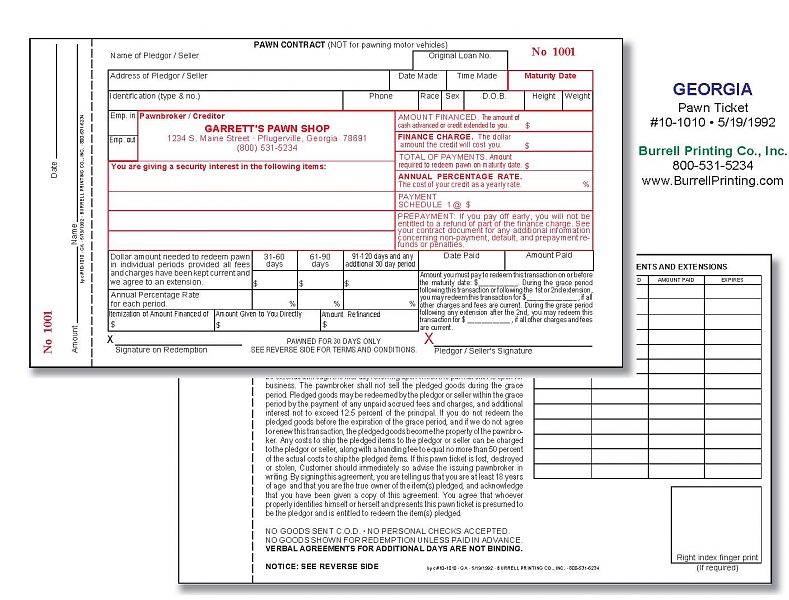 Georgia Handwritten Pawn Ticket 10-1010