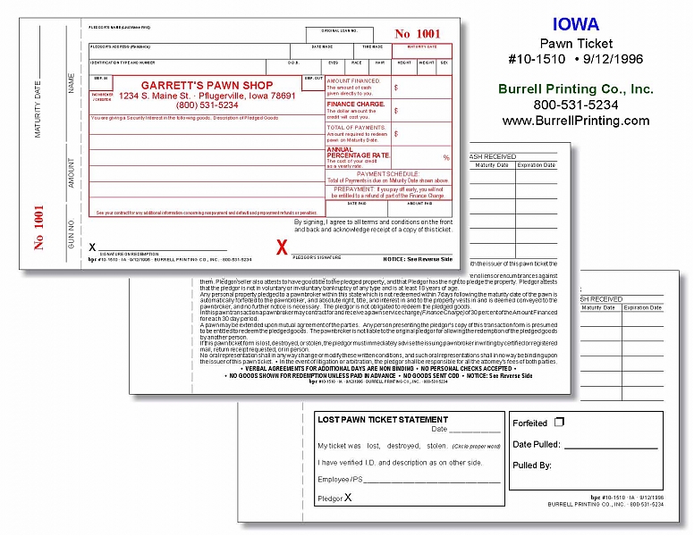 Iowa Handwritten Pawn Ticket 10-1510