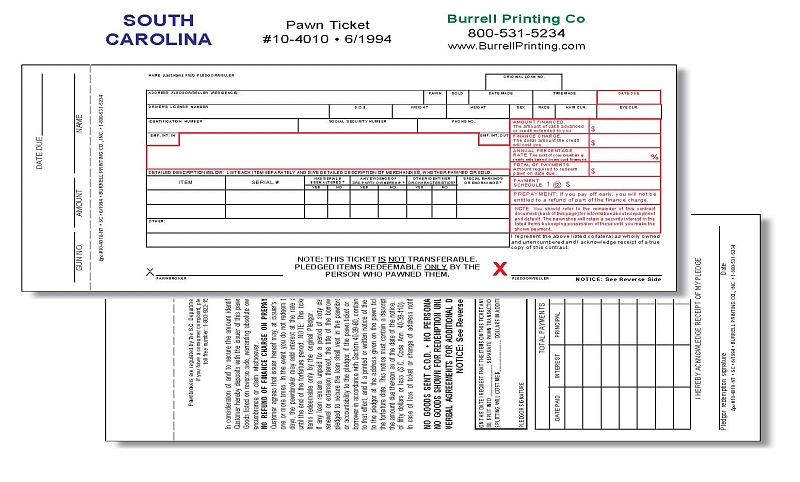 South Carolina Handwritten Pawn Ticket 10-4010