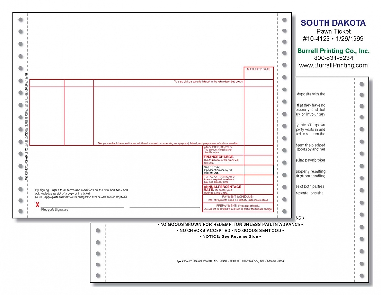 South Dakota Continuous Pawn Ticket 10-4126