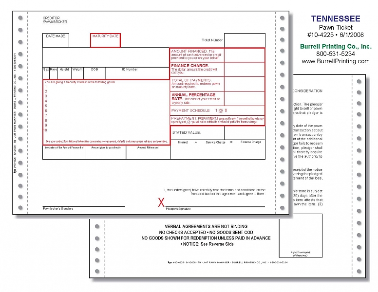 Tennessee Continuous Pawn Ticket 10-4225
