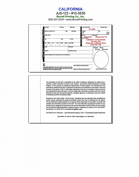 For use by California Secondhand Dealers when purchasing secondhand items and Gold from the public.